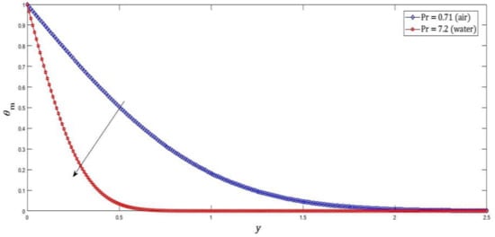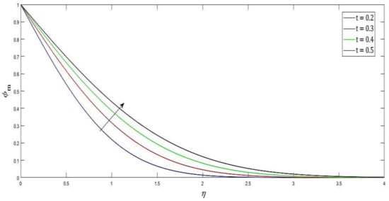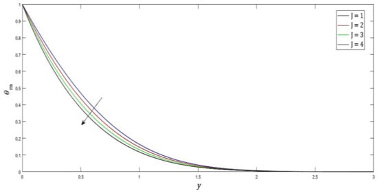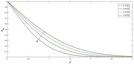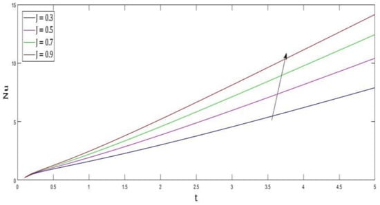 Figure 6 shows the influence of heat absorption. This finding is based on the heat absorption parameters, J = 0.6, 0.7, 0.8, and 0.9. The observation is documented for parallel surfaces. We discovered that the JF temperature is a declining function of the heat absorption parameter in the domain. This is because fluctuations in J represent a loss of latent heat, which causes the Jeffrey fluid temperature to drop in the flow pattern []. The hypothesis of temperature effects resulted in the creation of the heat transfer parameter. It’s important to remember that higher thermal conductivity can lead to an overflow of the thermal boundary layer. This phenomenon could be controlled by deploying a heat sink to reduce the heat and a heat source to raise its temperature to the maximum required level. Figure 7 and Figure 8 show the decrease in temperature profiles for various Prandtl numbers and time. For = 15, the peak velocity drops to around 0.9.