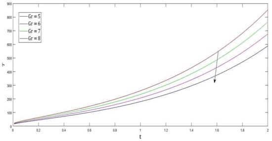 The potential numerical gains of skin friction τ are presented in Figure 14 and Figure 15 for different thermal and mass Grashof numbers. Moreover, it is seen that the skin friction is augmented with increasing potential gains of the thermal and mass Grashof number.