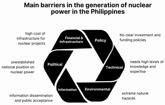 In recent years, there was a renewed interest and developments in nuclear energy in the Philippines. In July 2020, President Rodrigo Duterte (30 June 2016 to 29 June 2022 in office) signed the Executive Order (EO) 116, an issuance to develop the Civilian Nuclear Energy (CNE) and Nuclear Energy Program Inter-Agency Committee (NEP-IAC) to lead the Nuclear Power Program (NPP) for the Philippines, including viability studies of nuclear energy in the country, and further recommendations toward introducing nuclear energy in the country’s energy landscape []. The Department of Energy (DoE) of the Philippines has also signed a Memorandum of Intent with Rosatom Overseas JSC on having pre-feasibility research of nuclear power plants based on small modular reactor technology []. Such plans are in line with the goals of the Philippine Energy Plan (PEP) which will include nuclear sources in the energy mix by 2040, which is approximately comprised of a 70% base generation capacity from coal, geothermal, hydropower, natural gas, nuclear and biomass, 20% mid-merit capacity from natural gas, and 10% capacity for peaking from oil-based plants and VRE, such as solar PV and wind sources [,]. In addition, this case study evolved potential barriers and policy implications and a few recommendations were suggested to develop the nuclear power plant in the Philippines.