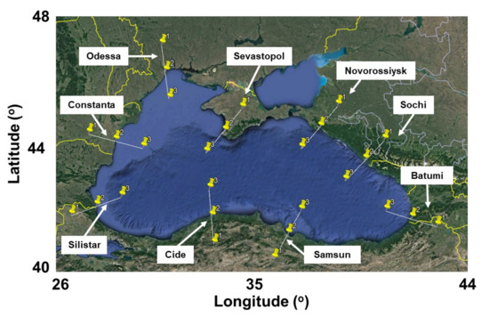 Black Sea target area including the reference points, where: 1—onshore; 2—alongshore; 3—offshore. Map processed from Google Earth, 2022.