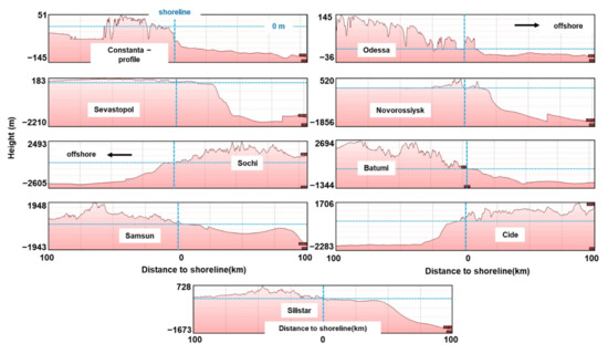 Figure 2 presents in more detail the profile lines, including information related to the sea level (height = 0 m) and the distance to the nearshore sites (distance from the shoreline = 0 km). In general, the water depth significantly increases as we go offshore, and as a consequence it will be necessary to use floating wind platforms, since in most of the cases the areas located near the shoreline will be already allocated for some other maritime activities. The marine sites located near Constanta/Odessa may allow the implementation of a monopile project, since they are located in a plateau area where the water depth is close to 50 m (or below).
