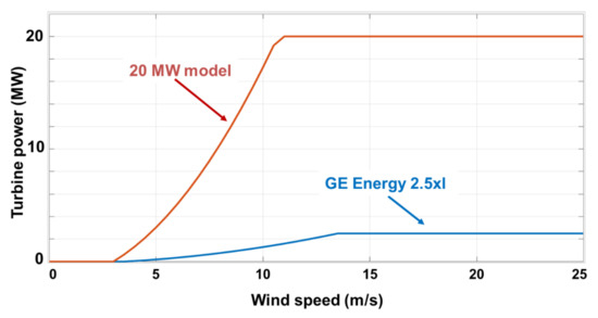 where: AEP—is expressed in GWh; T—number of operational hours in a year (8760 in this case); f(u)—Weibull function from Equation (2); P(u)—power curve of a particular wind turbine, defined by the cut-in/cut-out values. More details regarding the power curves of the two wind turbines used in this work can be found in Figure 3.