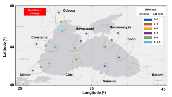 In Figure 4, the distribution of the U100 parameter (average values) considering the full time distribution is presented. The results are sorted according to different intervals that go from a minimum of 2.45 m/s to a maximum of 7.35 m/s. From this representation, we can clearly notice that the offshore sites are defined by much higher values that frequently exceed 7 m/s in the case of the western region. Considerably lower values are associated with the onshore sites from south and southeast, where for this time period the average wind speed values are below 3 m/s. The shoreline points from line Constanta, Odessa and Sevastopol are defined by similar wind conditions as the offshore points (100 km from the shore) associated with the lines Sevastopol, Novorossiysk, and Cide that present wind resources in the range 6–7 m/s.