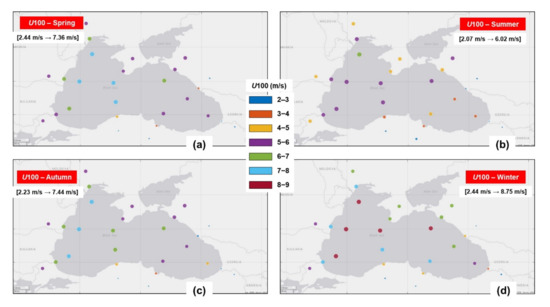 Seasonal distribution of the U100 parameter (average values) associated with the 20-year time interval January 2002–December 2021, where: (a) spring; (b) summer; (c) autumn; (d) winter. The numbers from the square brackets indicate the minimum and maximum values related to each map.
