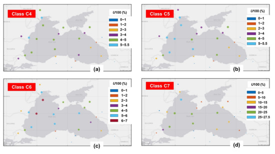 Distribution of U100 parameter by wind classes processed for the entire 20-year time period (2002–2021), where: (a) class C4; (b) class C5; (c) class C6; (d) class C7. This classification was made according to the information provided in Oh et al. [19].