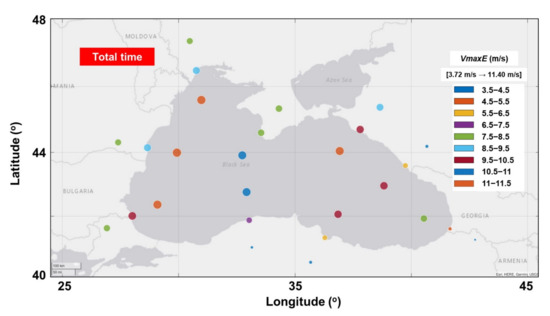 The evolution of the VmaxE indicator is provided in Figure 7, considering all the available wind data (U100—total time). According to these values, several patterns may occur. For example, the marine sites from the west constantly indicate values in the range 11–11.5 m/s in this section being also included a site from Novorossiysk. On the second place, we have the marine sites from Sevastopol and Cide (north and south) with maximum values of 11 m/s. Most of the onshore sites from west and north can be included in the interval 7.5–8.5 m/s, being expected also an increase to a maximum of 9.5 m/s in the case of the alongshore sites from Constanta and Odessa. The onshore sites from south and east present lower values that reach a minimum of 3.72 m/s, this being relatively close to the cut-in values of some high-capacity wind turbines.