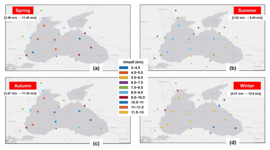 Seasonal distribution of the VmaxE indicator (in m/s) based on the U100 input, where: (a) spring; (b) summer; (c) autumn; (d) winter. The numbers from the square brackets indicate the minimum and maximum values related to each map.