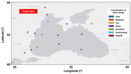 The aim of this work is not to make a direct comparison between the two wind generators (2.5 MW and 20 MW) since they are designed for different projects, this being the reason why in Figure 13 only the offshore sites were considered. On the other hand, the aim of this work is to make a direct comparison between the land and marine areas from the Black Sea region, and for this reason a 2.5 MW generator may represent a suitable solution, since we can find similar generators in the onshore projects (e.g., Cogealac, Romania) or in offshore ones (old technology). As for the marine areas, in the near future we can notice the occurrence of a new generation of wind turbines that may easily exceed 20 MW in terms of rated power, making them a suitable candidate for the Black Sea environment or for a repowering project. At this point, it can be also mentioned that in the work of Girleanu et al. [42], a total of 12 models of wind turbines, ranging from 2 to 10 MW, were evaluated for the Romanian coastal area, and a similar approach can be considered for some other regions of the Black Sea, especially in the case of the marine sites.