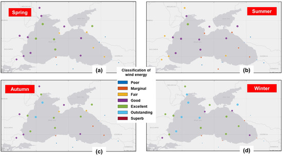 Figure 10 is focused on a similar evaluation, considering this time the values related to each season. Regardless of the season taken into account, none of the sites are rated as a C7 site, with expected values in the ranges: spring—0.33–0.78 m/s; summer—0.33–0.74 m/s; autumn—0.33–0.84; winter—0.37–0.87 m/s. During spring, a significant part of the sites is included in the classes C4 and C5 (good and excellent), while during summer the balance is shifted to class C4 and C3 (fair). For the autumn season, the marine sites from Constanta and Odessa are included in the class C6, while from the winter interval the onshore sites from Odessa and Novorossiysk may also present interest.