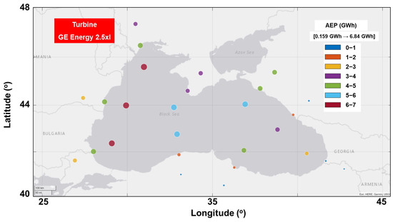 The annual electricity production (AEP) of an individual GE Energy 2.5 xl system is taken into account in Figure 11, by considering all the reference sites (onshore and offshore). By looking at these data, we can notice that the production range goes from 0.159 to 6.84 GWh, with better performances being expected in the western sector. From the marine sites located in the west (Odessa, Constanta, and Silistar), we may expect a production in the range 6–6.84 GWh, that gradually decreases to 4.5 GWh for the shoreline sites and further to 2.3 GWh for the onshore ones. In the case of the eastern sector, only the marine site from Novorossiysk can exceed a production of 5 GWh, while for the onshore sites in this area (east and south) the production does not exceed 1 GWh.