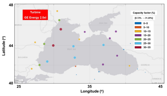 Figure 12 presents the spatial distribution of the capacity factor reported for this wind turbine. Better performances are expected in the offshore areas, where a maximum value of 31.2% is expected near Constanta and Odessa, while a maximum of 30% may be reached by the marine sites from the central part of the Black Sea. Close to the shoreline, the capacity is relatively close to 25% (western sector) or 20% (northern sector), and does not exceed 5% in the case of the eastern and southern sites. For the onshore sites located on the western sector, a capacity factor in the range 10–15% is expected.