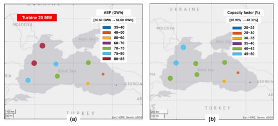 In Figure 13, the performances of the 20 MW wind turbine are presented, considering this time only the marine sites. For the AEP indicator (Figure 13a), the values go in the range 34.6–84.6 GWh, indicating the sites from Constanta and Odessa as the most promising. The performances of this turbine gradually decrease from west to east, in the conditions where the sites from the central parts can reach maximum values of 75 GWh, and drops to 60 GWh in the case of the Samsun site and finally reaches 36.6 GWh near Batumi.