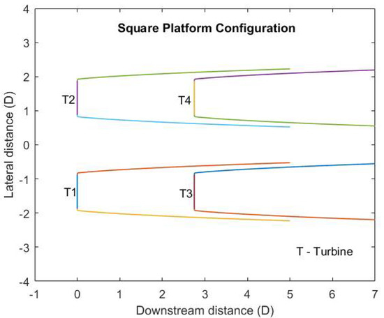 For downstream wind turbines, there is a possibility of wake overlap, and if the overlap of the wake is from two upstream wind turbines, then the wind speed can be estimated as the average of the wind speeds [26,45]. The three platform configurations considered for this study are square, pentagon, and hexagon-shaped platforms. For a square-type platform configuration, the four wind turbines are placed at each corner, separated by a distance of 2.75 times the rotor diameter in the crosswind and downwind directions. For pentagon and hexagon platform configurations, the wind turbines are arranged in three rows. For the pentagon platform, the 2 wind turbines (T1 and T2) in the first row are 1.5 rotor diameters apart in crosswind direction, the third-row turbine (T5) is placed at a 2.75 Dr distance downstream of the first row, and the 2 turbines in the second row (T3 and T4) are placed in between the first and third row in the windward direction, whereas in the crosswind direction they are placed to avoid the wake expansion with an added 20% of the rotor diameter distance between the tip of the wake and the wind turbine rotor. The hexagon configuration is similar to the pentagon except for the two turbines (T5 and T6) in the third row instead of one. The Larsen wake loss model implemented on the three configurations using MATLAB is shown in Figure 1, Figure 2 and Figure 3.