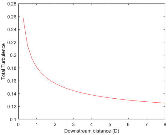 where is the atmospheric turbulence intensity assumed to be between 5% and 8% for offshore, which depends on the temperature variations between different altitudes [38,39,40], and is the wake added turbulence for spacing larger than 2D as a function of axial distance () and is given by: