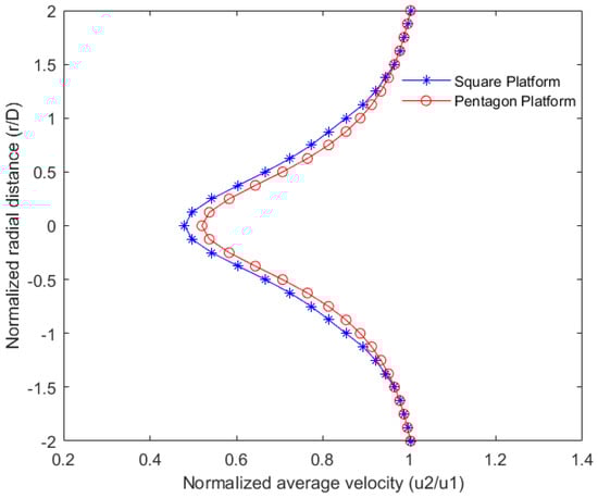 The normalized velocity profile for the downstream wind turbine at a 2.75 Dr distance downstream for the three platform configurations (T3 for square, T5 for the pentagon and hexagon) is depicted in Figure 13. The velocity profile is approximately similar for the most part in the square and hexagon platforms as the wind turbines are in the direct wake. It can also be observed that the velocity for the pentagon configuration is slightly higher than in the other two cases, which can correlate to the values from the Larsen wake loss model shown in Figure 6.