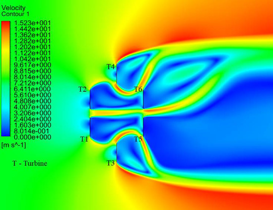 The discretized model of the pentagon configuration of mesh 2 is shown in Figure 8. The pressure-based coupled algorithm is used as the solution method for solving the momentum and continuity equations with second-order upwind discretization for the convection terms of the flow equations. A uniform wind speed of 12.5 m/s is used as a velocity inlet boundary condition with an atmospheric turbulence intensity of 10% and a viscosity ratio of 10%. The atmospheric pressure is selected as the outlet boundary condition. The value of the residual used for obtaining the convergence criteria of the CFD analysis is below 10−4. The velocity contours of the three platform configurations are shown in Figure 9, Figure 10 and Figure 11. It can be observed that there is a velocity deficit downstream of the wind turbines in all cases which corresponds to the wind turbine wake that is surrounded by the varying turbulence intensity, as shown in Figure 12.