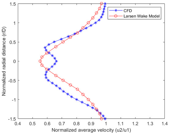 For the hexagon platform, the top part of the curve shows a reduced velocity due to the presence of the wind turbine (T6) at a 1D rotor diameter. The normalized velocity profile of the analytical Larsen wake model and CFD results at the downstream wind turbine of the pentagon platform is shown in Figure 14. Table 3 shows the comparison between the Larsen wake model and CFD analysis values of normalized streamwise velocity near the downstream wind turbine in the wake for the three platform configurations. The values show a good comparison between the analytical Larsen wake model values and the CFD simulation results.