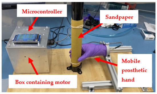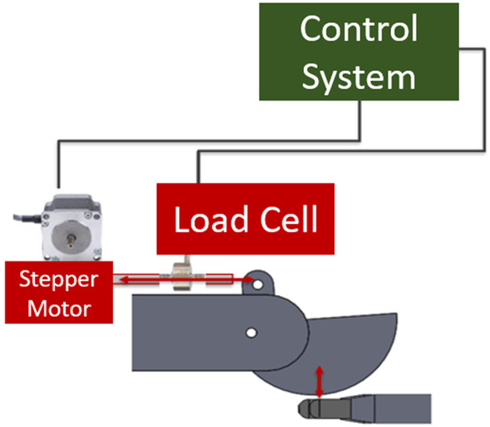 The plastic wedge-shaped drum was designed for easy application of sandpaper, which was held in place using two clamps, one on either end of the drum (Figure 10). A stepper motor controlled the movement of the drum by applying a horizontal force to an attached metal rod. The force caused the drum to pivot around a center pin, creating perpendicular contact with the fingertips of the hand. In order to control the force with which the drum contacts the hand, an in-line 10 kg load cell was calibrated using a second load cell and installed on the same rod that is moved by the stepper motor (Figure 10). Both the stepper motor and the load cell were electronically wired to the control center (Figure 11).
