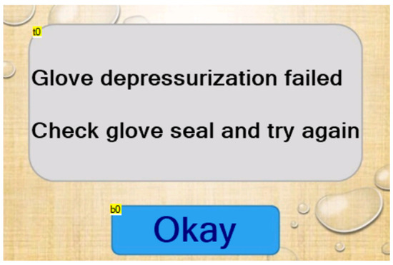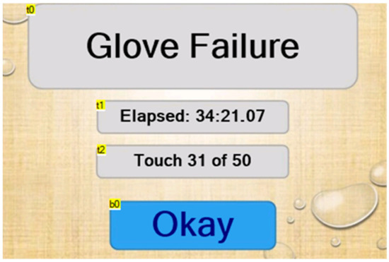 The glove failure page is displayed when a pressure differential is detected by the sensor, indicating that the glove has been punctured. The elapsed time and number of touches are paused so that the user can note them down (Figure 6). Pressing the “Okay” button returns the user to the homepage (Table 8 and Table 9).