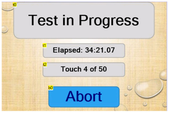 The test page appears after the glove has successfully been depressurized and the drum has begun to move. It displays the current elapsed time as well as the touch number that the machine is currently executing (Figure 4). It should be noted that the elapsed time is paused during the process of depressurization. A test can be aborted at any time by pressing the “Abort” button. Otherwise, the machine automatically switches to the “test complete” page once the glove has failed (Table 5 and Table 6).