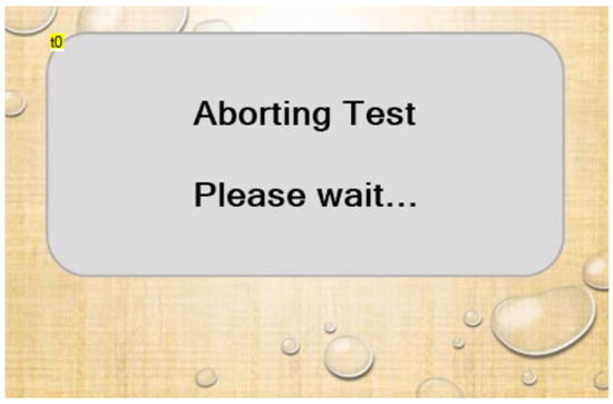 The test abort page is displayed after the “Abort” button has been selected (Figure 5). There are no buttons on this page, as its purpose is to inhibit user input until the machine has returned to the pre-test configuration (Table 7). The most time-consuming part of that process is the movement of the drum into the home position. Once the machine returns to the pre-test configuration, the display automatically switches to the home page.