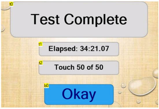 When the number of touches reaches the pre-set value without the glove failing, the “test complete” page is displayed (Figure 7). The elapsed time is paused so that the user can note it down. The machine returns to the home page when the “Okay” button is pressed (Table 10 and Table 11).