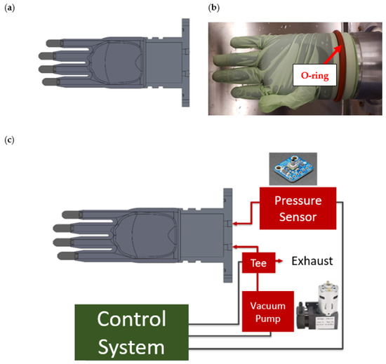 (a) AutoCAD model of 3D printed prosthetic hand. (b) Silicone O-ring applied to the base of the prosthetic hand. (c) Diagram of the connections between the prosthetic hand, vacuum pump, pressure sensor, and control system.