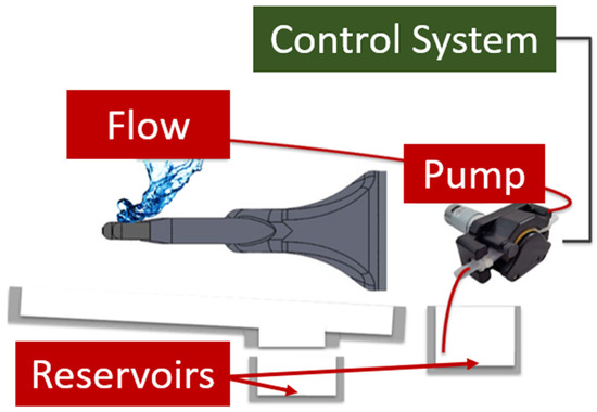 The liquid system allows the user to test the durability of medical gloves after the gloves are exposed to various solvents. The hand, drum, and spray nozzles were encased in a plexiglass testing chamber to keep the liquid contained during testing. The two spray nozzles were aligned to point at the fingertips of the hand (Figure 10a). The reservoirs were placed within the base of the device, and they consisted of two large plastic bottles with lids containing tubing that connect to either the pump or the liquid-collection pan (Figure 12). A 12/24 VDC peristaltic pump was chosen for the liquid system, and it was connected to the control system so that the user can adjust the number of liquid sprays between touches (Figure 12). The liquid stream was designed to leave the nozzle as a “drip” rather than a spray. This design choice was made to ensure user safety when performing tests with liquids that are toxic when aerosolized, such as ethanol.