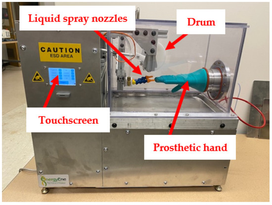 Figure 8 shows a conceptual drawing of the basic components of the device. Notably, the new system is encased in plexiglass and contains a pump and reservoir system for testing gloves in wet conditions with various solvents. Another notable difference from the C-GAD is the stationary prosthetic hand and mobile drum. This design choice was made to allow the prosthetic hand to be easily interchanged with other prosthetic hands of various sizes.