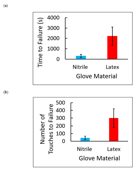 (a) Failure times in seconds for nitrile and latex examination gloves. The average failure time for nitrile gloves was 300 ± 164 s, and the average failure time for latex gloves was 2206 ± 888 s. Each value is the mean of 5 ± SD. (b) Number of sandpaper touches to failure for nitrile and latex examination gloves. The average number of touches for nitrile glove failure was 42 ± 23 touches, and the average number of touches for latex gloves was 300 ± 121. Each value is the mean of 5 ± SD.