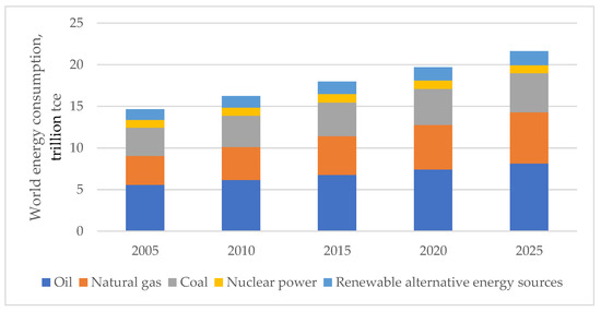 As seen from the figure, the consumption of primary energy worldwide in the period from 2005 to 2020 increased by 20%; in 2025, additional growth of 5–7% can be expected [1,2,3].
