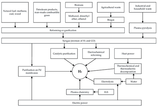 The main methods for producing hydrogen are conventionally divided into physical, electrochemical, and chemical ones [29,30,31]. Physical methods include those processes where the raw material (such as coke oven gas or gas produced by pyrolysis of butadiene) already contains free hydrogen, and we only need to extract it from the rest of the components in one way or another physical way. In electrochemical methods, hydrogen is released from its chemical compounds by decomposition of the latter under the effect of electric current. Chemical methods for producing hydrogen are the most common ones and involve incomplete oxidation (gasification, reforming) or thermal decomposition of fossil fuels.