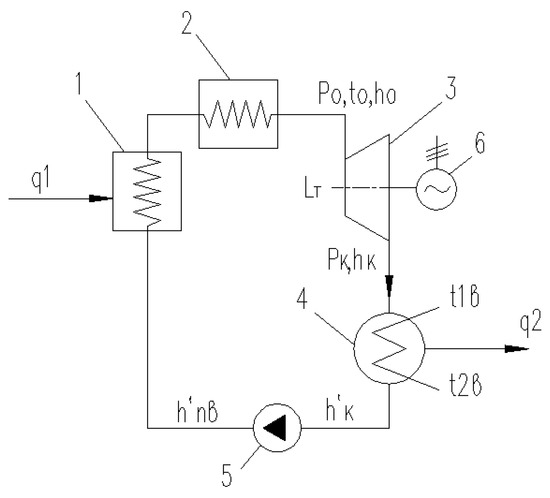 The simplest diagram of a steam turbine plant is shown in Figure 4. It includes a boiler (steam generator) (1), an overheater (2), a turbine (3), a condenser (4), a feed pump (5), and an electric generator (6).