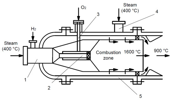 - Aminov, R.Z.; Egorov, A.N. Hydrogenoxygen steam generator for a closed hydrogen combustion cycle. Int. J. Hydrogen Energy 2019, 44, 11161–11167. [Google Scholar] [CrossRef]
