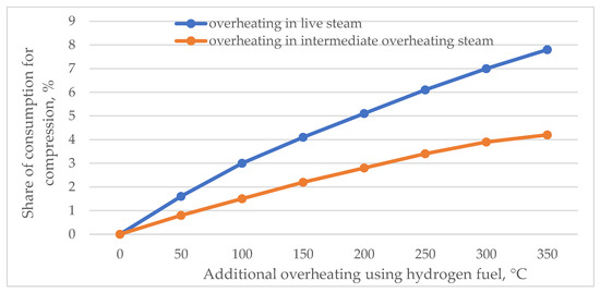 Share of additional power consumed for hydrogen and oxygen compression depending on the additional overheating using hydrogen fuel.