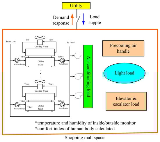 The system architecture studied in this paper is shown in Figure 1. Utility supplies power to the shopping mall to satisfy the load. Shopping malls then implement the demand response strategies in consideration of the comfort of people in the mall and the schedules of the air-conditioner system. With minimal cost as the goal, the optimal operation with demand response strategies is established to get the maximal benefits of a shopping mall.