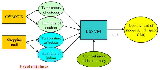 The temperature and humidity of the outdoor environment were obtained from the Central Weather Bureau Observation Data Inquire System (CWBODIS) [], and the indoor temperature and humidity of commercial shopping malls were collected in the EXECL database. Based on the above information, the cooling load forecasting of the shopping mall was simulated by the LSSVM, as shown in Figure 2. Furthermore, body comfort was also considered in this research. The comfort index of the human body () is one of the indexes to describe the comprehensive influences of temperature (), humidity (), and spatial environment wind velocity () on the human body, as shown in Equation (3) [], indicating whether people feel comfortable at a certain temperature and relative humidity. Different combinations of temperature and relative humidity were used to represent the chilling capacity of an air-conditioned space.
