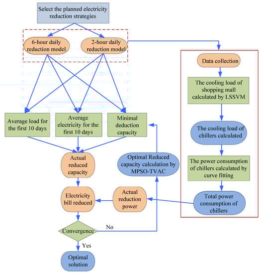 In test cases, the optimal agreed reduced capacity calculated by MPSO-TVAC is increased from 0 kW to 433 kW, the actual reduced capacity is increased from 0 kW to 259.920 kW, and the reduction of the basic electricity bill is increased from 0 NT to 29,045.64 NT. If the internal ambient temperature is set above 28 °C, the actual reduced capacity will be greater than 0 in Case 5 to Case 6, so that the basic electricity bill can be reduced. Therefore, if the total electricity consumption of the system can be reduced overall, the 6-h daily reduction model in the planned strategies for electricity consumption reduction will be the most beneficial.