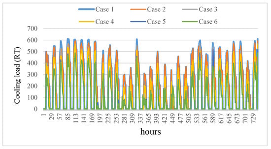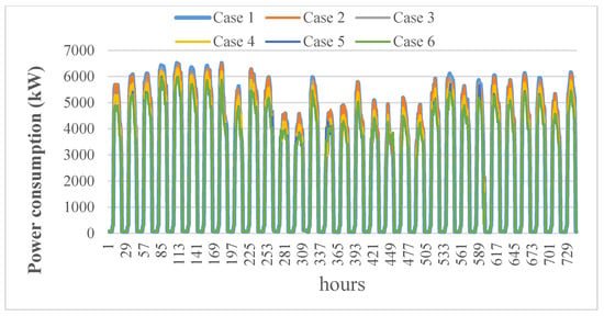 The proposed algorithm was tested in a commercial shopping mall. The shopping mall evaluated in this study covered an area of about 62,810 square meters and has roughly 170 stores. The mall had four large chiller units, three 860 HP chiller units, and one 560 HP chiller unit, totaling 3140 HP, to provide air conditioning for the mall. The electricity cost for the chillers was calculated based on the announced summer and non-summer prices from the TOU rate []. The temperature and relative humidity in the shopping mall were initially set as 26 °C and 45%, respectively. According to the electricity consumption model, the power demand rose greatly after 10:00 a.m.; moreover decline sharply after 10:00 p.m. In this study, Case 1 to Case 6 were designed based on the comfort index (CI). The temperature ranged from 26 °C to 28 °C, the relative humidity ranged from 45% to 55%, and the wind velocity was fixed at 1 m/s, indicating that the ambient temperature could make people feel warm and comfortable. Table 5 shows the corresponding parameters of the studied cases.