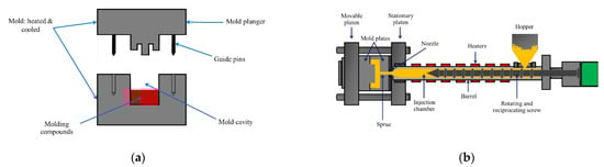 Examples of traditional manufacturing processes: (a) compression molding; (b) injection molding.