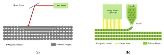 Examples of additive manufacturing processes for magnetic materials: (a) selective laser melting; (b) extrusion.