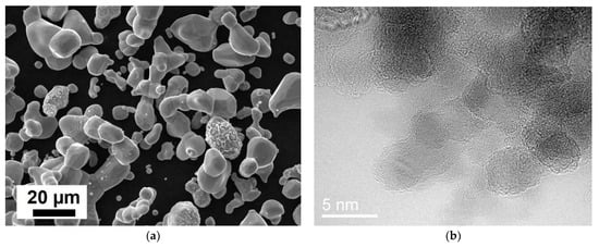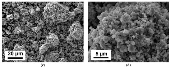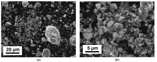 For our explorations, commercially available powders of chromium and nanodiamonds were used (Figure 1). The average particle size of chromium powder was 5–10 µm. The size of primary nanodiamond particles was 5 nm, but the nanodiamonds were combined in agglomerates up to hundreds and thousands of micrometers in size. The content of nanodiamond particles in the explored composites was 15% by volume.