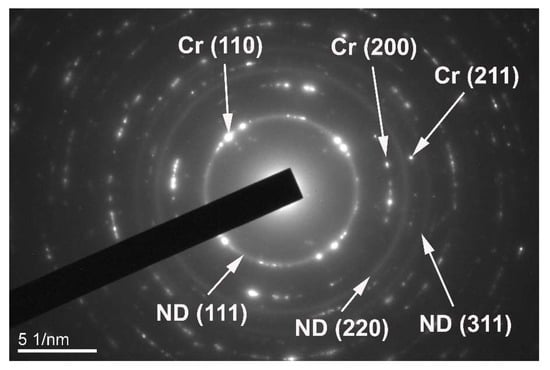 It is impossible to identify crushed nanodiamond agglomerates in mixtures with metals using X-ray diffraction methods (the reason for this is explained in [,]). The presence of nanodiamonds can be proven using the synchrotron radiation or transmission electron microscopy methods. Figure 3 shows the electron diffraction pattern obtained when examining the composite (chromium + 15% nanodiamonds by volume) after 2 h of processing using transmission electron microscopy. Diffraction rings from nanodiamonds (111), (211), (311), along with single reflexes from the chromium material (110), (200), (211), etc., can be seen clearly. It is worth noting that the location of the reflexes from chrome (110) coincides with the ring from nanodiamonds (111). The presence of diffraction rings from nanodiamonds points to the fact that at this stage the nanodiamonds were not transformed into the graphitic material, and did not react with chromium, forming carbides, and reducing the size of the chromium particles substantially (chromium was present in the examination zone not in the form of monocrystal, but in the form of polycrystal).