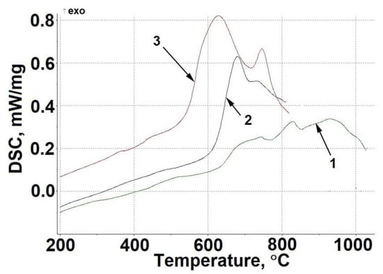 Results of the DSC study of “chromium + 15% nanodiamonds” composites: (1) after 0.5 h; (2) after 2 h; (3) after 4 h.