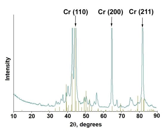 These composites generate interest for several reasons. Chromium is a metal that is widely used in engineering. Substantial amounts of chromium are used in coatings, including electrochemical ones. However, when producing electrochemical chromium coatings, the use of carcinogenic materials cannot be avoided. This fact reduces the attractiveness of such technologies. There are other techniques for applying coatings (e.g., gas dynamics [,], frictional cladding [], etc.). However, to improve the efficiency of such coatings, when chrome is used, it is necessary to modify the chromium material to improve its wear resistance, durability, etc. This paper considers such a modification of the chromium material using nanoparticles, providing an opportunity to improve the mechanical properties of the material without degrading the quality of its surface.