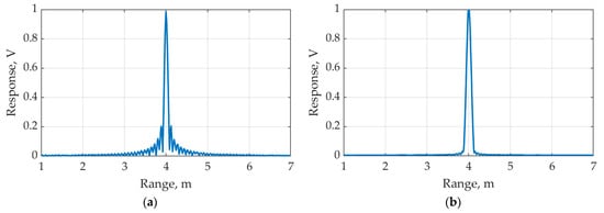Multiplicative weighting with the window functions made it possible to reduce the level of the side lobes of the TRF, however, it led to a deterioration in the range resolution as a result of the expansion of the main lobe of the TRF []. The chosen window increased the resolution in about 1.25 times, which was considered acceptable. If the local peak did not fit the time instant, its position could be refined with curve interpolation techniques, e.g., fast polynomial algorithm [,].