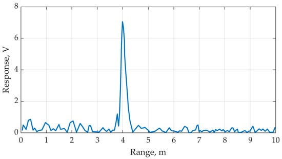 The resultant curve obtained via processing the samples , where the choice of K0 = 2 is made and the values are involved, is shown in Figure 4. The comparison between curves shown in Figure 3b and Figure 4 shows that using the interperiodic subtraction algorithm, the level of the signal of interest, corresponding to the target which is at a distance of 4 m, has significantly increased. Thus, the signal happens to exceed the reflection from the wall by about 4 times, i.e., by 6 dB, while the average level of interference from the stationary objects is lower by more than 15 times (or about 12 dB).