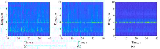 The line within ranges from 2 to 6 m in all images in Figure 8 resembles the triangular pulse train and corresponds to the signal of interest reflected from a moving human. It can be additionally seen that the NDS algorithm provides a higher SNR, which is expressed as a larger amplitude (warmer colors) of the signal of moving and stationary targets. The latter reproduced the horizontal line at a range of 4 m. It can be noticed that the signal of the human who was not moving is much weaker than the signal of a walking person. The former is barely noticeable in Figure 9c, even with the NDS algorithm applied. This signal is practically indistinguishable in the images obtained by means of the inter-periodic subtraction and local variance algorithms—Figure 9a,b.