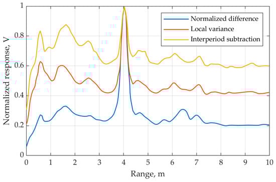 The curves shown in Figure 8 show that each of the three algorithms provides detection of the signal of interest reflected by the target at the distance of 4 m. However, the resulting values of SNR differ noticeably: 2 dB (in 1.6 times) for the interperiod subtraction algorithm, 3.7 dB (in 2.3 times) for the local variance algorithm, 6 dB (in 4 times) for the NDS algorithm.