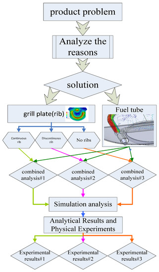 In this study, ANSYS CFX analyses were conducted utilizing a coupled analysis model method based on combustion thermodynamics, heat transfer, and finite element methodologies. The objective is to prevent the fracturing or failure of barbecue stone grills. The process flow has been described in Section 2 and Figure 2. The initial goal is to understand the causes of the problem. Our analysis and experiment results indicated that the cracks on stone grilling plates were due to two main reasons. Further thermal imaging results indicated that the heat of the stone grill plate was concentrated at the outlet of the fuel nozzle. Moreover, the temperature difference on the stone grill plate was extremely large and generated local thermal stress, which caused the stone grill plate to crack in the location opposite to the fuel pipe. The second step is to improve the temperature of the mixed air entering the combustion tube to increase the flow rate and velocity of the airflow through the top of the flame to the bottom surface of the stone grill. Additionally, it is necessary to ensure that the temperature of the stone grill plate is maintained at the same level. The third step is to improve the design of the continuous ribs and quantify the improvements through simulations. A cross-analysis was performed by integrating the second and third steps, and optimal results were obtained. Finally, a physical experiment was conducted to confirm that the improved stone grill plate generated a uniform temperature across its entire surface. The proposed method can effectively prevent the fracturing of the stone grill plate caused by thermal stress and thus, its service life can be prolonged.